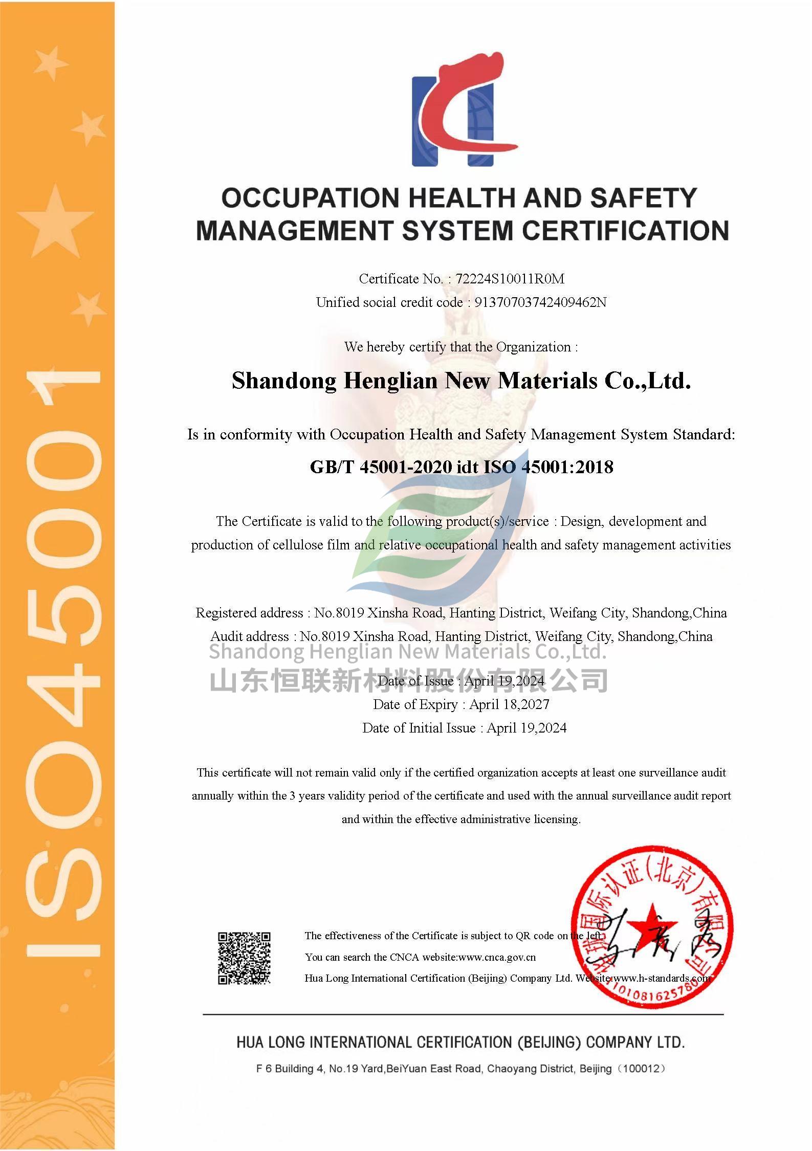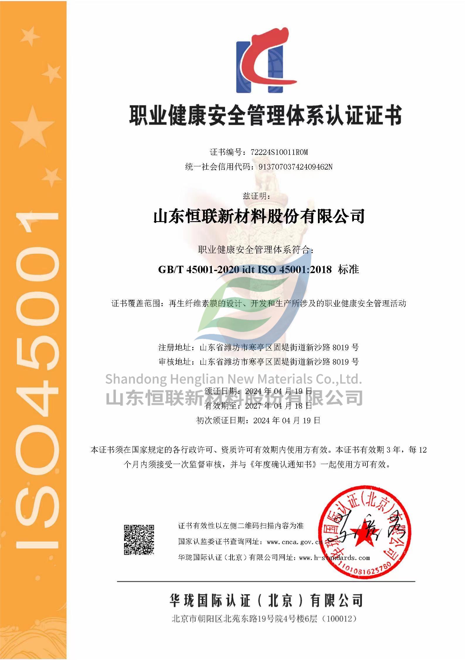 ISO45001職業(yè)健康安全管理體系認(rèn)證證書