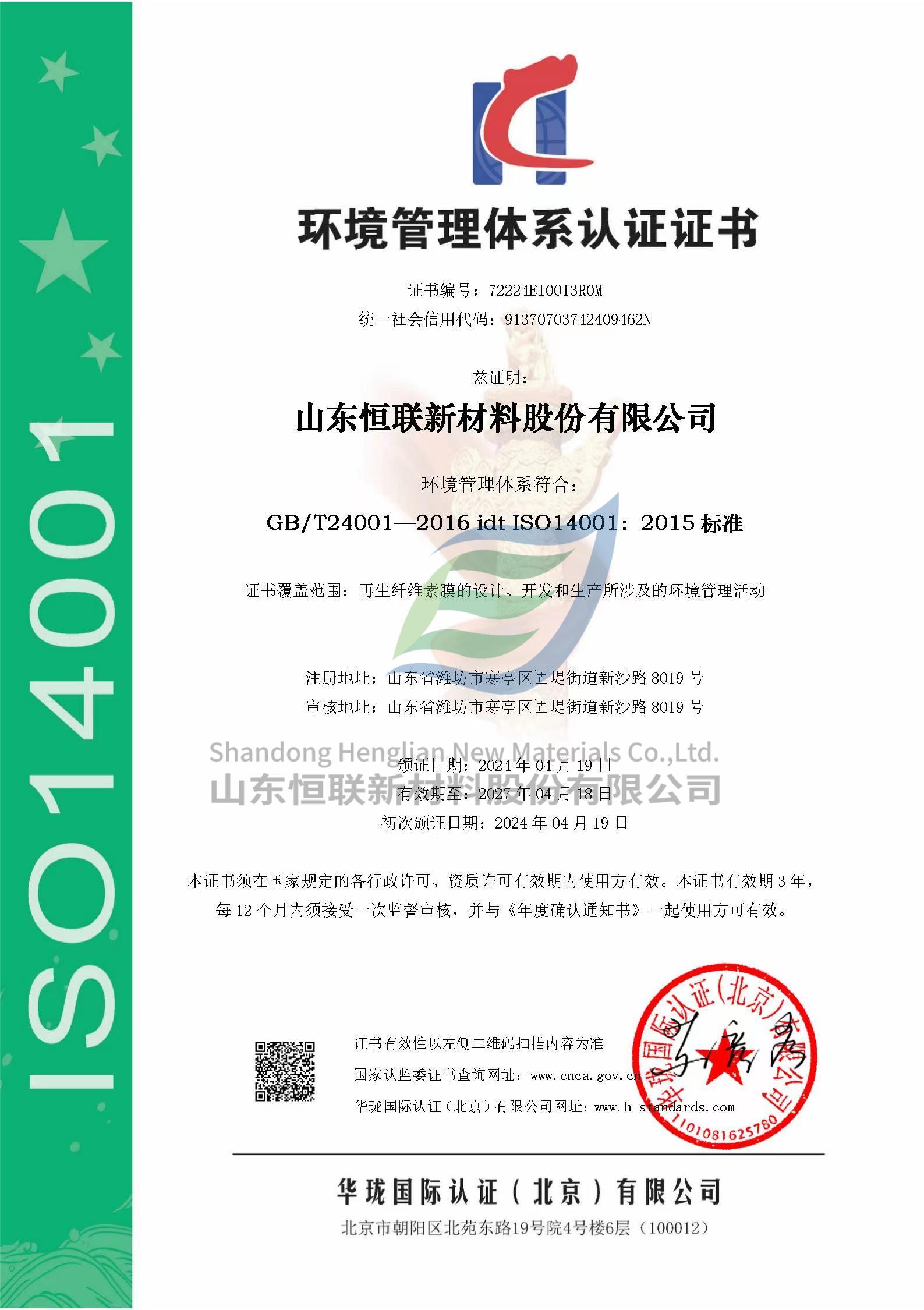 ISO14001環(huán)境管理體系認(rèn)證證書